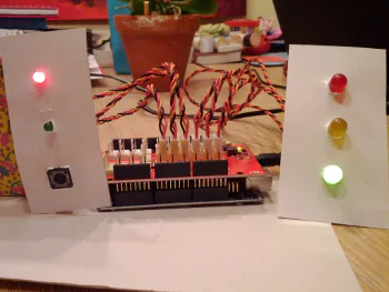 Meine Tochter Jade (1. Klasse) hat auf ihrem Schulweg eine Straße mit einer Fußgängerampel zu überqueren. Damit sie das Konzept in allen Aspekten versteht, haben wir ein „Projekt“ daraus gemacht und die Ampel mit einem Arduino (Microcontroller) nachgebaut. So wurde für sie ein weniger interessantes Thema plötzlich richtig spannend.